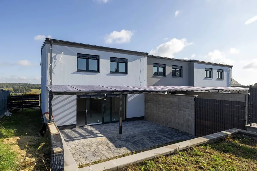 Obrovskou výhodou je fakt, že jsou u domu dokončeny veškeré venkovní úpravy (kromě finální výsadby zahrady). Přístřešek pro auta, kompletní oplocení, opěrná zídka s vydlážděnou terasou za domem, která je zastřešená pergolou.