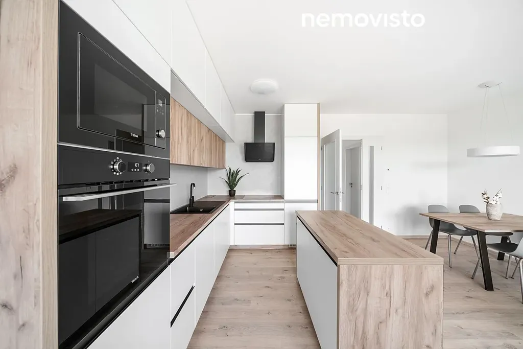 Moderní bytová jednotka číslo B54 o dispozici 3+kk se dvěma terasami splňuje ty nejvyšší nároky na komfortní bydlení. Posuďte sami. Obývací pokoj s kuchyňským koutem o výměře 27 m2 nabízí přímý vstup na prostornou terasu. Kuchyňská linka na míru je vybavena vestavěnými spotřebiči (indukční varná deska, digestoř, horkovzdušná trouba, mikrovlnná trouba, myčka nádobí a lednice) a vybavena kuchyňským ostrůvkem. Nechybí jídelní stůl, židle, sedačka nebo televize. Maximální komfort zajistí elektrické venkovní žaluzie a podlahové vytápění v každé místnosti.