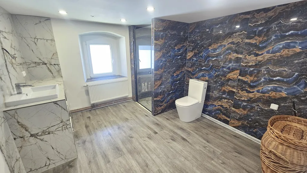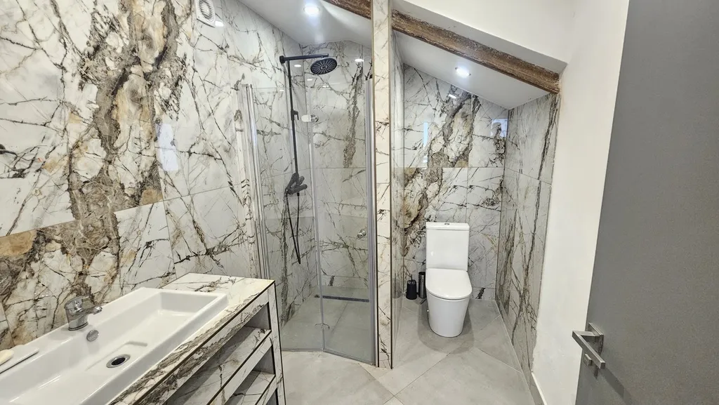 Dva prostorné pokoje (každý 64 m²), koupelna se sprchovým koutem (18,5 m²) a samostatné WC. Opět elektrické vytápění a ohřev vody.
