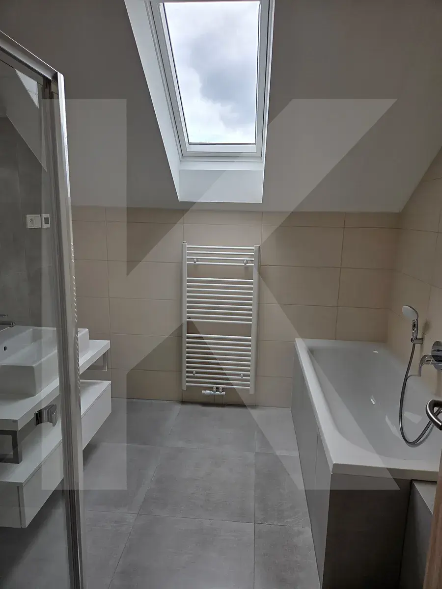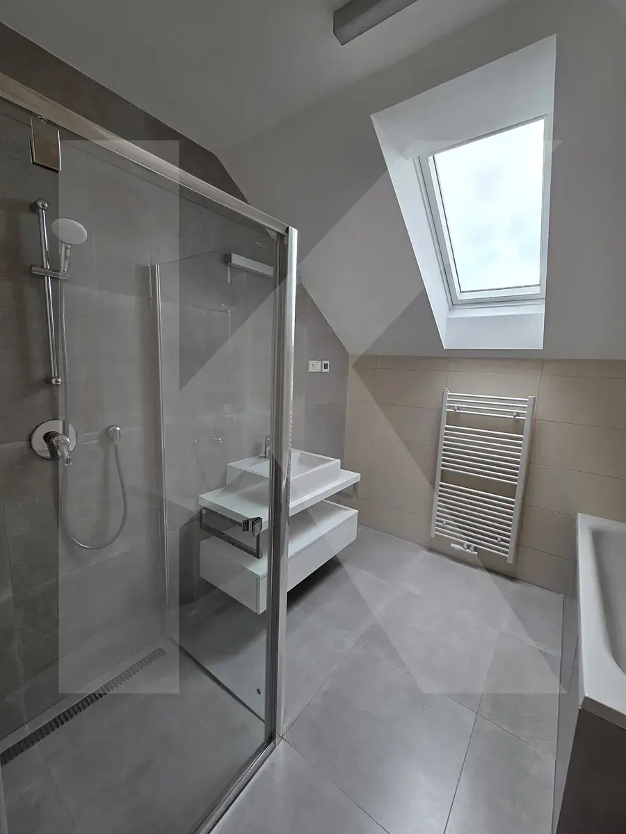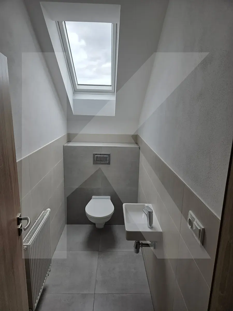 Dále v patře najdete samostatné wc s umyvadlem, koupelnu s vanou a sprchovým koutem.
