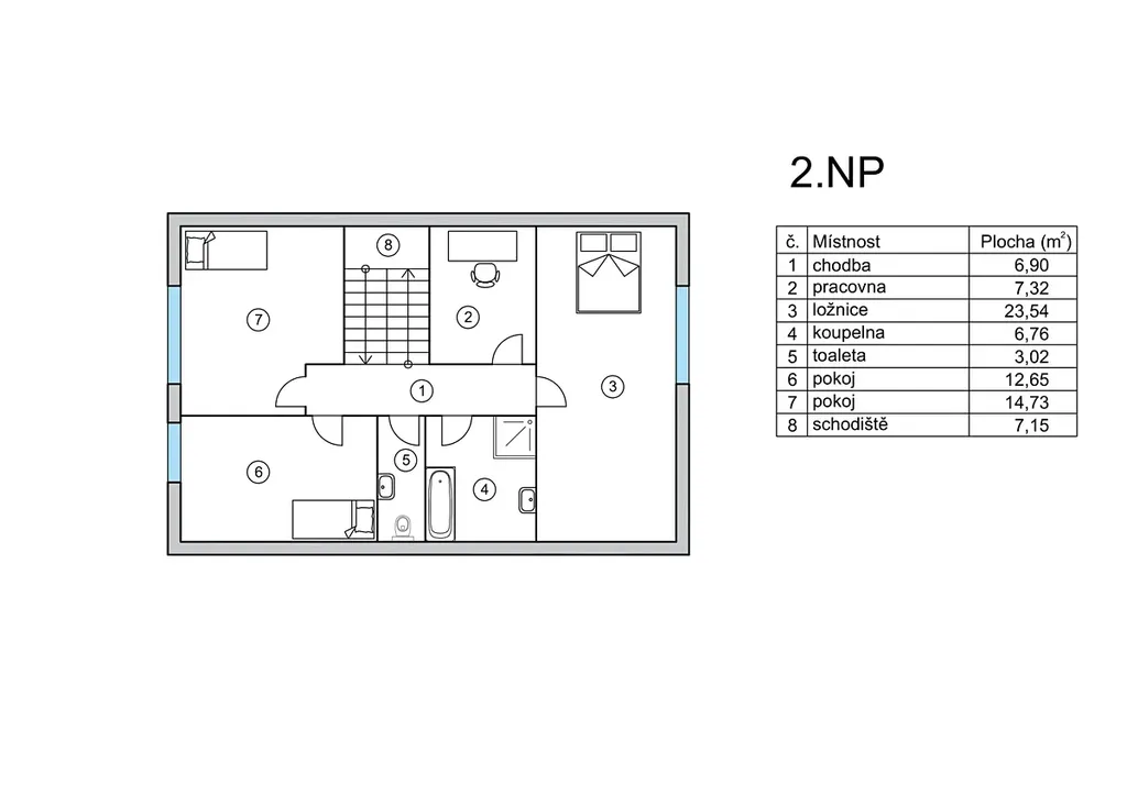 Dominantou domu je velkorysý obývací prostor propojený s kuchyní, jídelnou, krbovými kamny a vstupem na terasu, který tvoří světlé a vzdušné centrum každodenního života. Dispozice dále nabízí čtyři ložnice a pracovnu – ideální řešení pro větší rodinu, home office nebo pokoj pro hosty.
