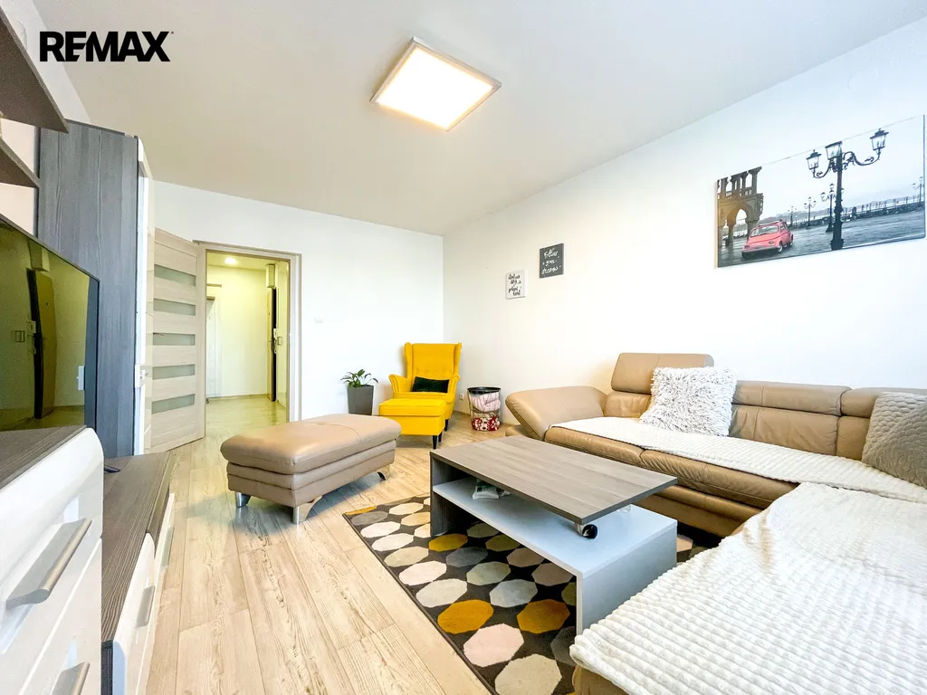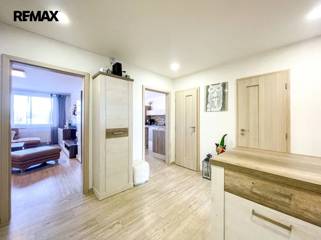 Po vstupu do bytu se dostanete do prostorné předsíně, kde je dostatek úložného prostoru pro všechny vaše věci. Dále se zde nachází prostorný obývací pokoj s moderní televizní stěnou. Kuchyň je zde velice velkoryse řešená a disponuje všemi potřebnými spotřebiči. Nachází se zde myčka, lednice s mrazákem, elektrická trouba a mikrovlná trouba, a také plynový sporák. V centru kuchyně je praktický ostrůvek, na který navazuje jídelní stůl. Je zde také vchod na jeden ze dvou balkonů v bytě.