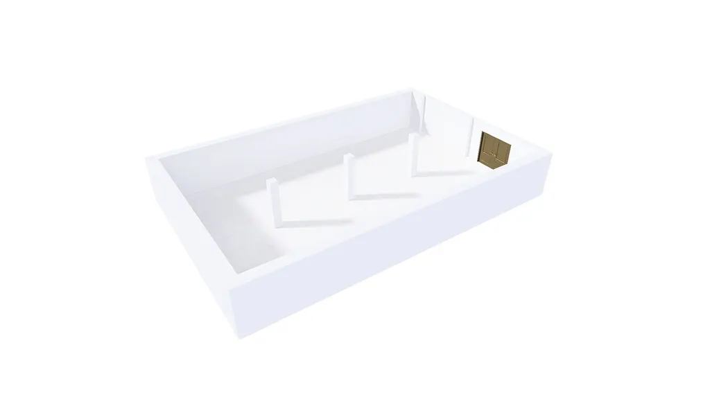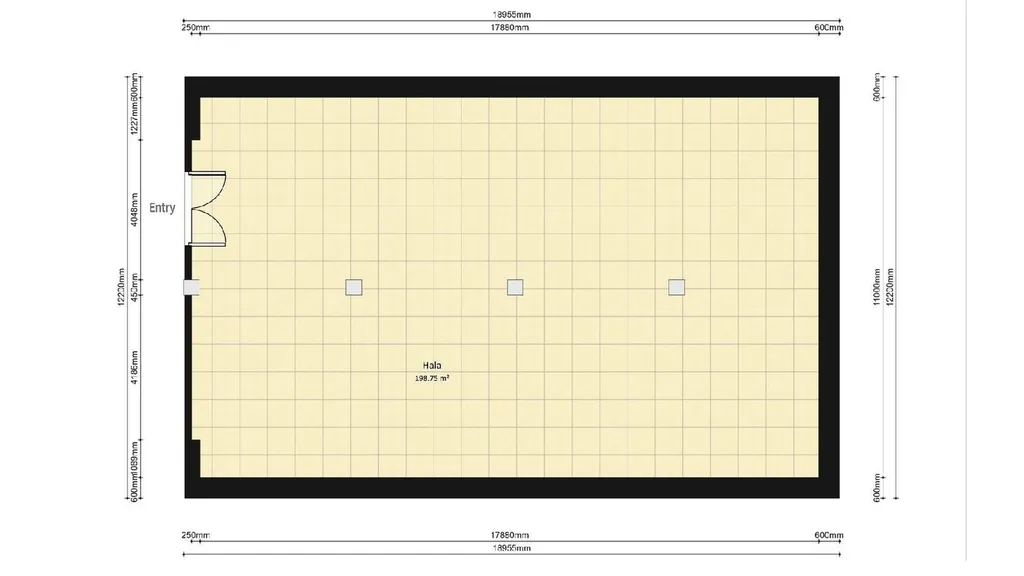 Dispozice a rozměry: Délka: 18,1 m | Šířka: 10,7 m | Výška stropu: 5 m (vhodné pro regálové systémy).