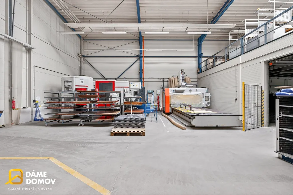Přímo v hale se nachází jeřáb, který výrazně usnadňuje manipulaci s těžkými břemeny a zvyšuje efektivitu provozu.