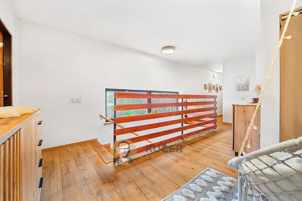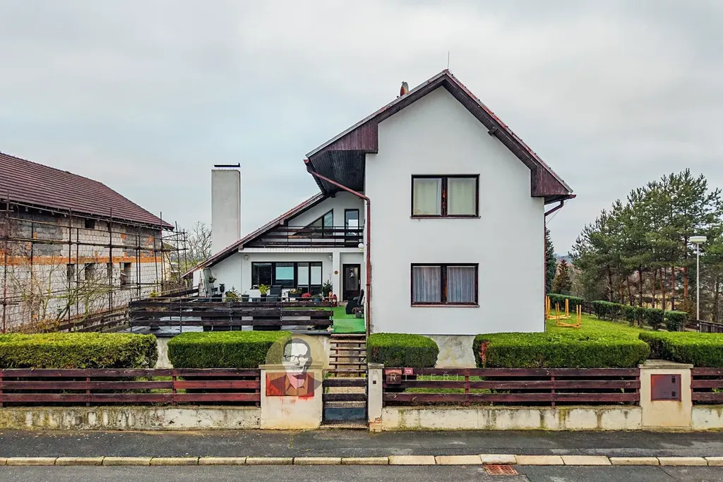 Dům má v přízemí - vyvýšeném patře prostornou terasu, obývací pokoj s krbem, další dva pokoje, kuchyň s jídelnou a koupelnu. V patře pak tři ložnice a koupelnu. Součástí je také půda, která je pochozí a nabízí vybudování dalších minimálně dvou pokojů.