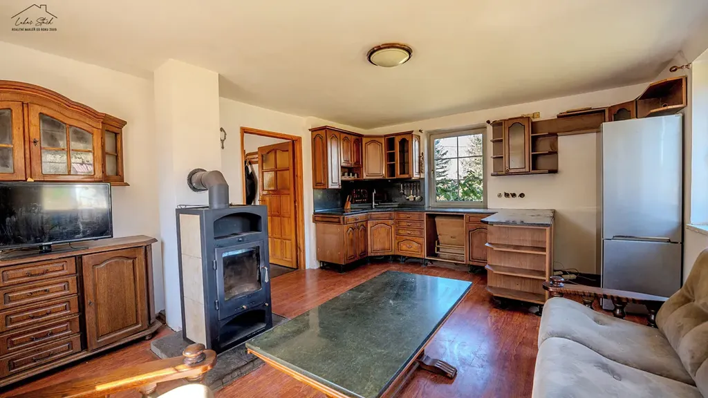 Další možností vytápění je krb, který majitelé využívali jako hlavní zdroj tepla. Ohřev vody je řešen bojlerem.