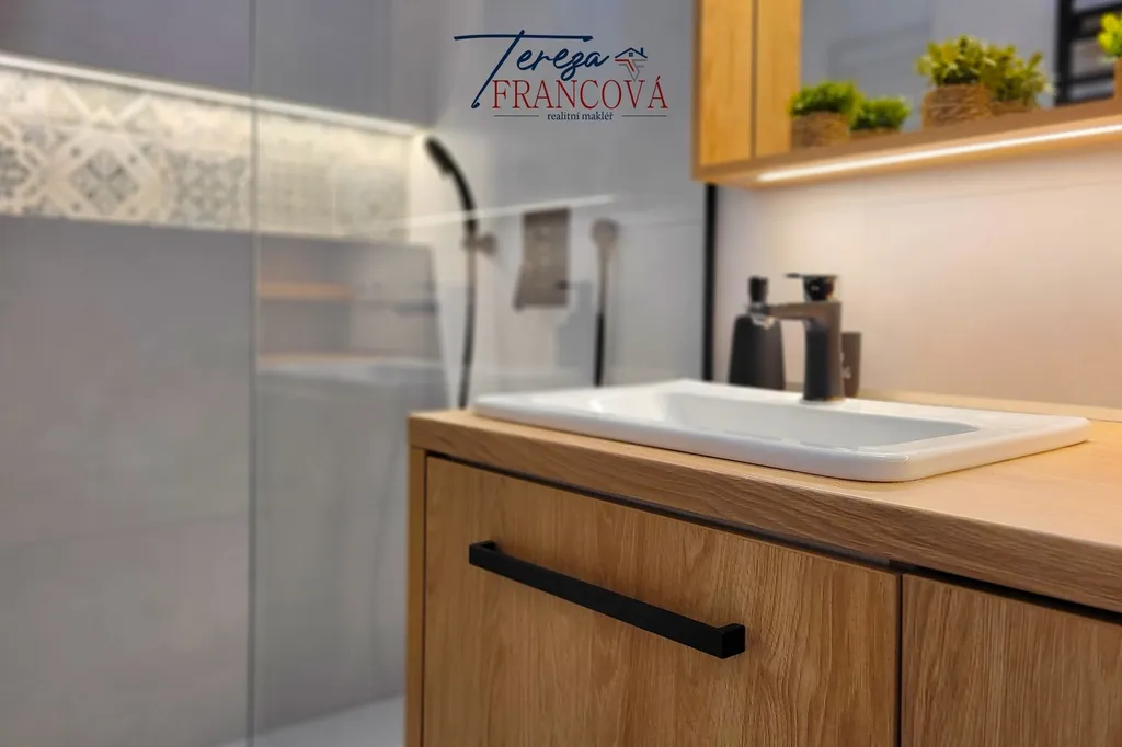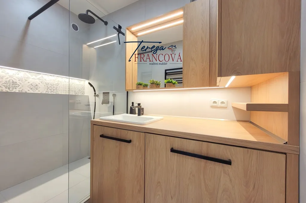 Koupelna byla navržena s důrazem na praktičnost a vzdušnost – sprchový kout se skleněnou zástěnou a chytrými úložnými prostory zajišťuje maximální komfort při každodenním užívání.