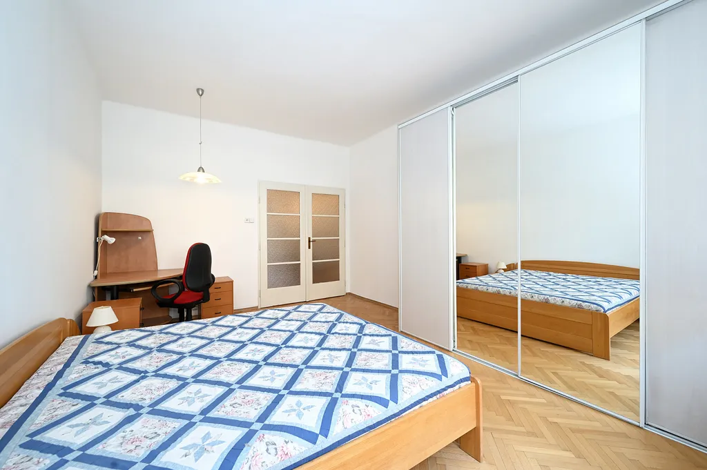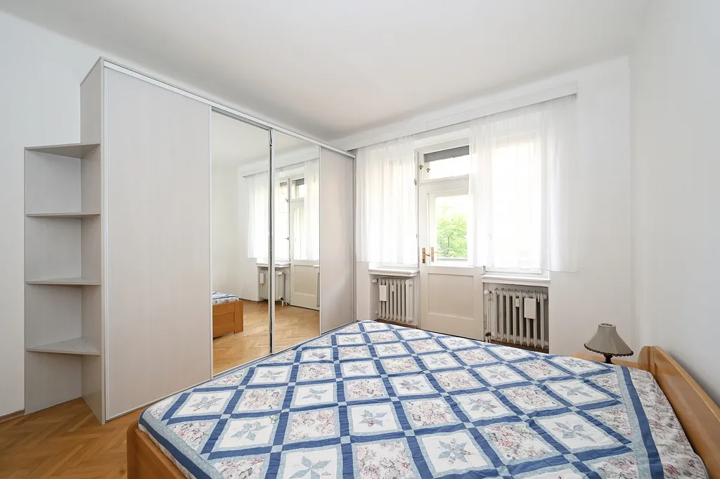 We offer for rent a very nice, spacious and fully furnished apartment in a house constructed in 1930's near Náměstí Jiřího z Poděbrad with a view of Plečnik's Church of the Sacred Heart of Jesus and in the immediate vicinity of the Metro A and tram stops. It is situated on the 2nd floor with elevator in a quiet street. Living area 82m² with central heating - two large living rooms with separate entrances from the living hall, this part of the apartment with wooden parquet floors, spacious, bright and fully furnished kitchen with appliances and washing machine, living hall in the middle of the apartment connects separate rooms with glass doors, children's room, bathroom with whirlpool massage bathtub, toilet and pantry/storage space. The apartment includes an open balcony, small hallway, apartment doors are eqipped with security lock. There are furniture, TV and built-in wardrobes for the tenant at his disposal.