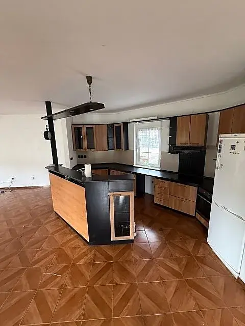 Velice prostorný prosklený slunný obývací pokoj přes 60m2 s kuchyň.linkou s veškerými vest.spotřebiči, s ostrůvkem, s krbovou vložkou na tuhá paliva, s několika vstupy přes francouzké okno na terasu téměř 40m2 s přímým vstupem do bazénu.