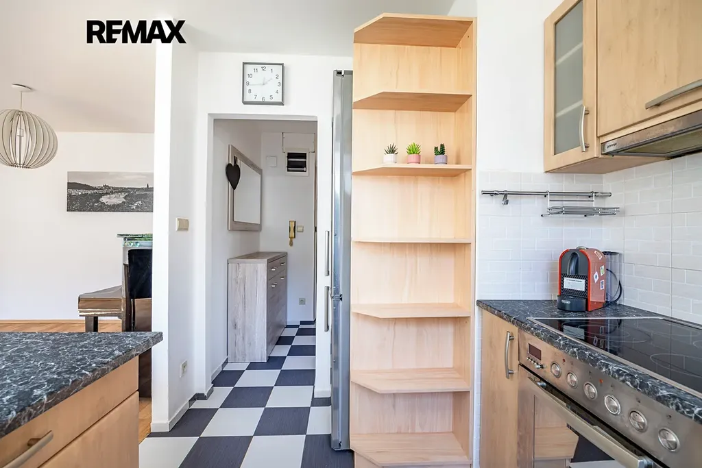 Velká okna zajišťují dostatek denního světla a byt působí velmi vzdušně. Nabízí se jako částečně vybavený a je v udržovaném stavu, připravený k okamžitému nastěhování.
