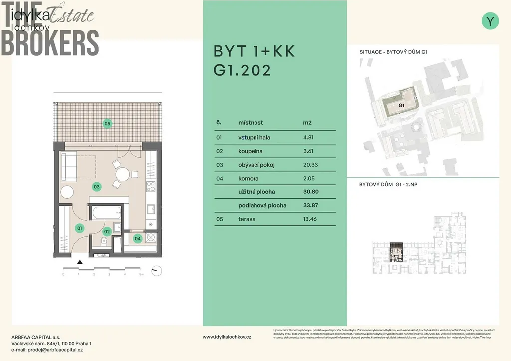 Světlý východně orientovaný byt s dispozicí 1+kk a podlahovou plochou téměř 34 m² plus terasou 13m² se nachází v druhém podlaží novostavby.