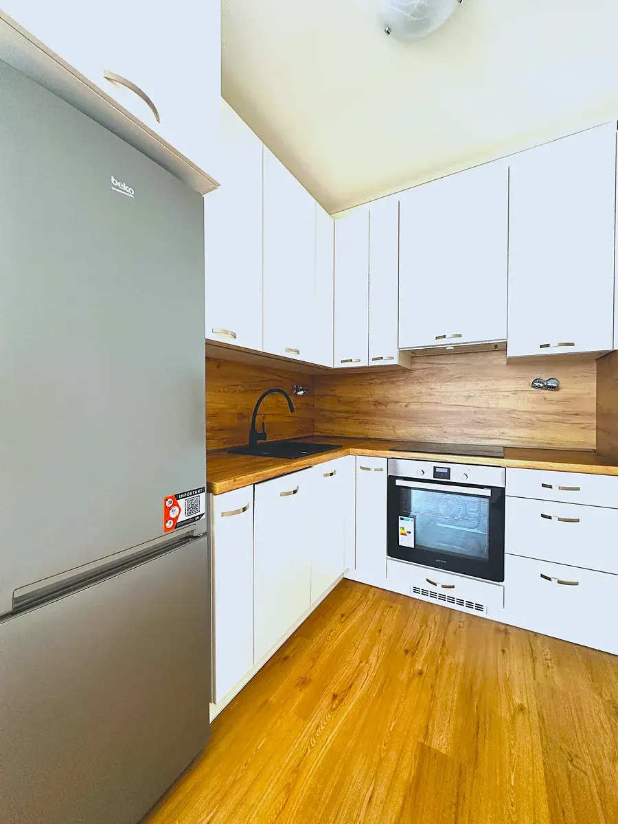 Dovolujeme si Vám nabídnout pod výhradním zastoupení, pronájem slunného bytu velikosti 2+kk, 43 m2, nacházejícího se v 3. patře s nákladním výtahem panelového domu na adrese Přecechtělova ve Stodůlkách. Jedná se o klidnou lokalitu s dochozí vzdáleností od občanské vybavenosti. Byt prošel kompletní rekonstrukcí v tomto roce a nabízí následující dispozice, vstupní předsíň 5 m2 opatřena vestavěnou skříní s botníkem a věšákem, dále navazuje oddělený vstup do místnosti WC 1 m2 a místnosti koupelny 2,5 m2, kde je nově vestavěn sprch. kout, umyvadlo s pákovou baterií, prostor pro pračku. Dále čelně z předsíně je k dispozici ložnice 12 m2 a oddělená místnost obývací vč. vybaveného kuchyňského koutu 18 m2, obsahující varnou indukční desku Guzzanti, troubou Guzzanti, digestoří, dále dřez vč. vodovodní baterie, myčka Candy, lednice s mrazničkou Beko. Okna plastová vč. vnitřních žaluzií a garnýže. Topení je zajištěno formou dálkového ústředního topení přes radiátory a centrálního ohřevu vody. Byt nabízí v suterénu domu místnost sklepu. MHD: Bus, Červeňanského 142, 184, 225, 904 v dochozí vzdálenosti s návazností na metro linky Nové Butovice s dojezdem do 8 min. Preferujeme pár s možností nastěhování se od dubna, května.