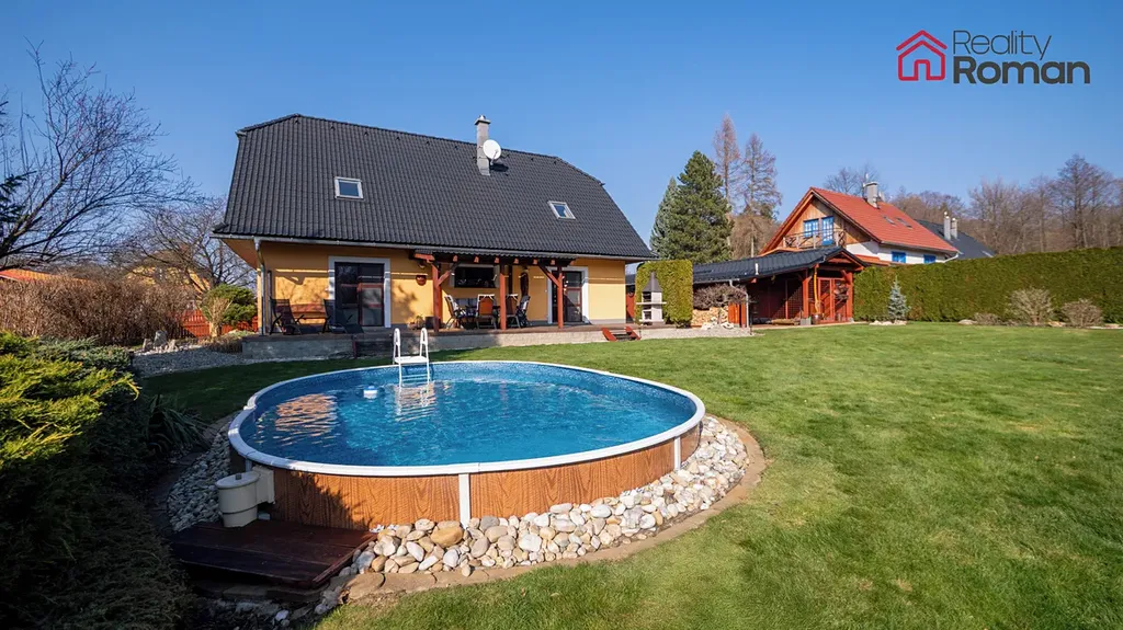 Zahrada je udržovaná se vzrostlou zelení a relaxačními zónami. Součástí je bazén s tepelným čerpadlem, terasa (cca 40 m²) a venkovní krb.