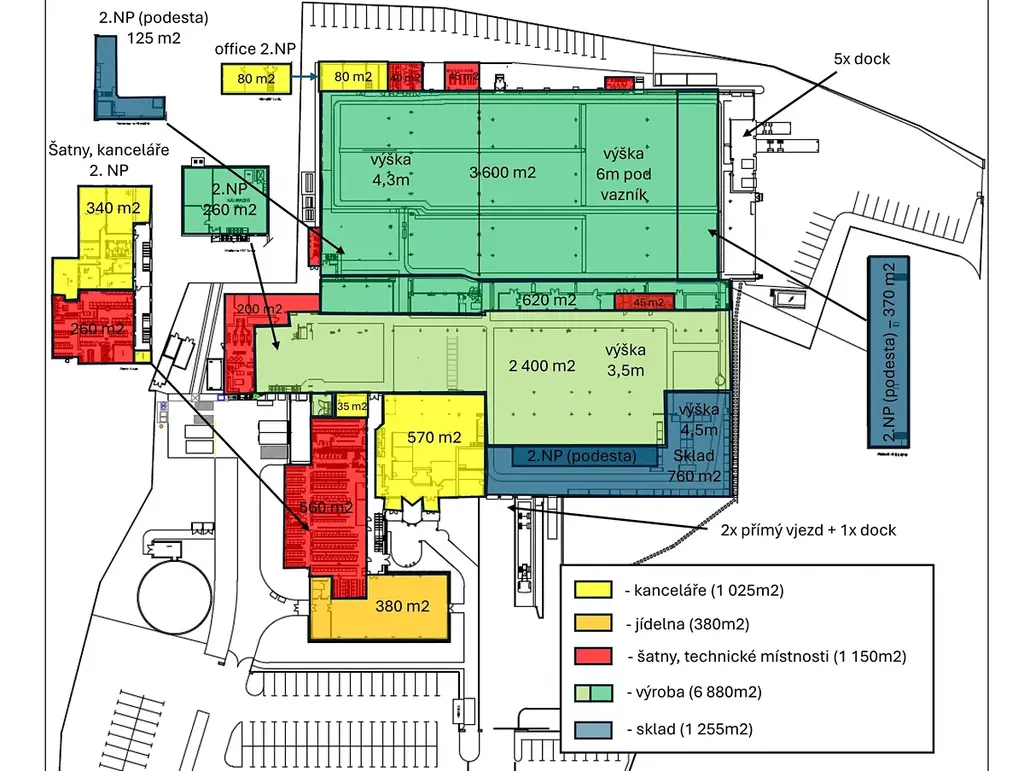 V budově jsou k dispozici prostory jak výrobní, tak i skladové.
