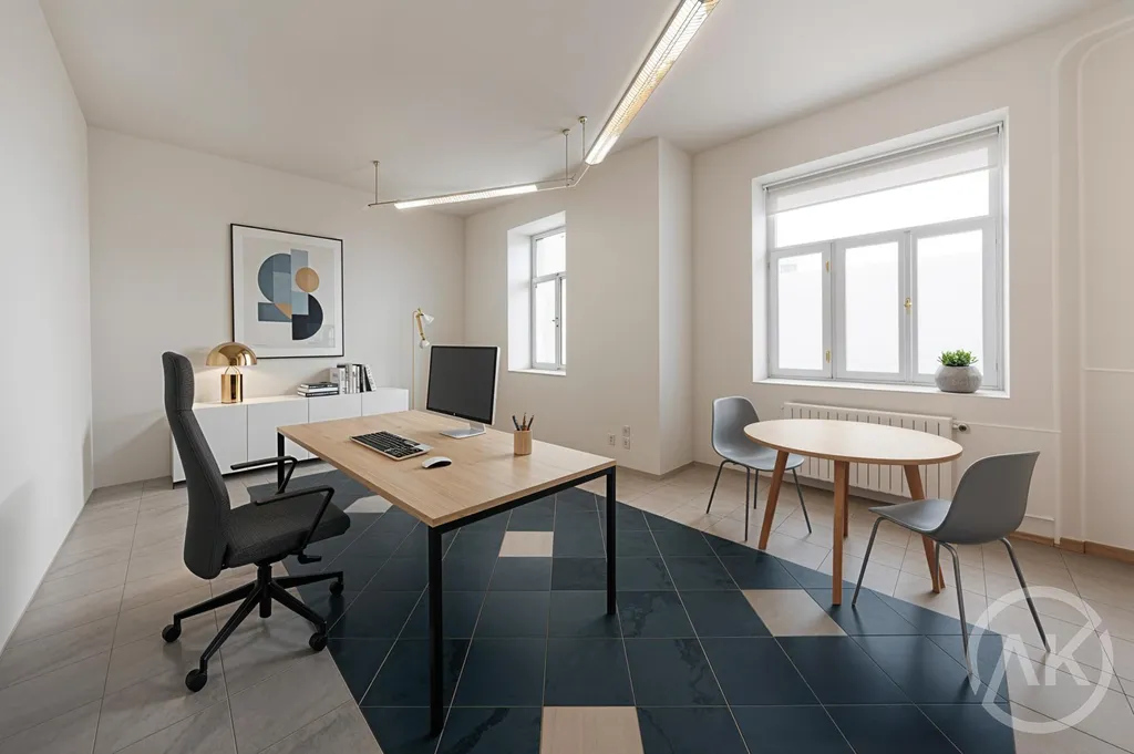 Kancelář vidíte virtuálně zařízenou na fotografiích a také nezařízenou, tak jak ji uvidíte v reálu.