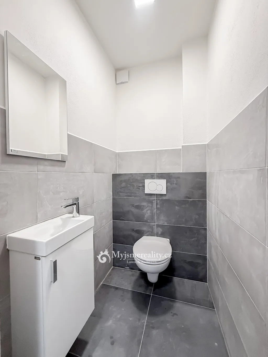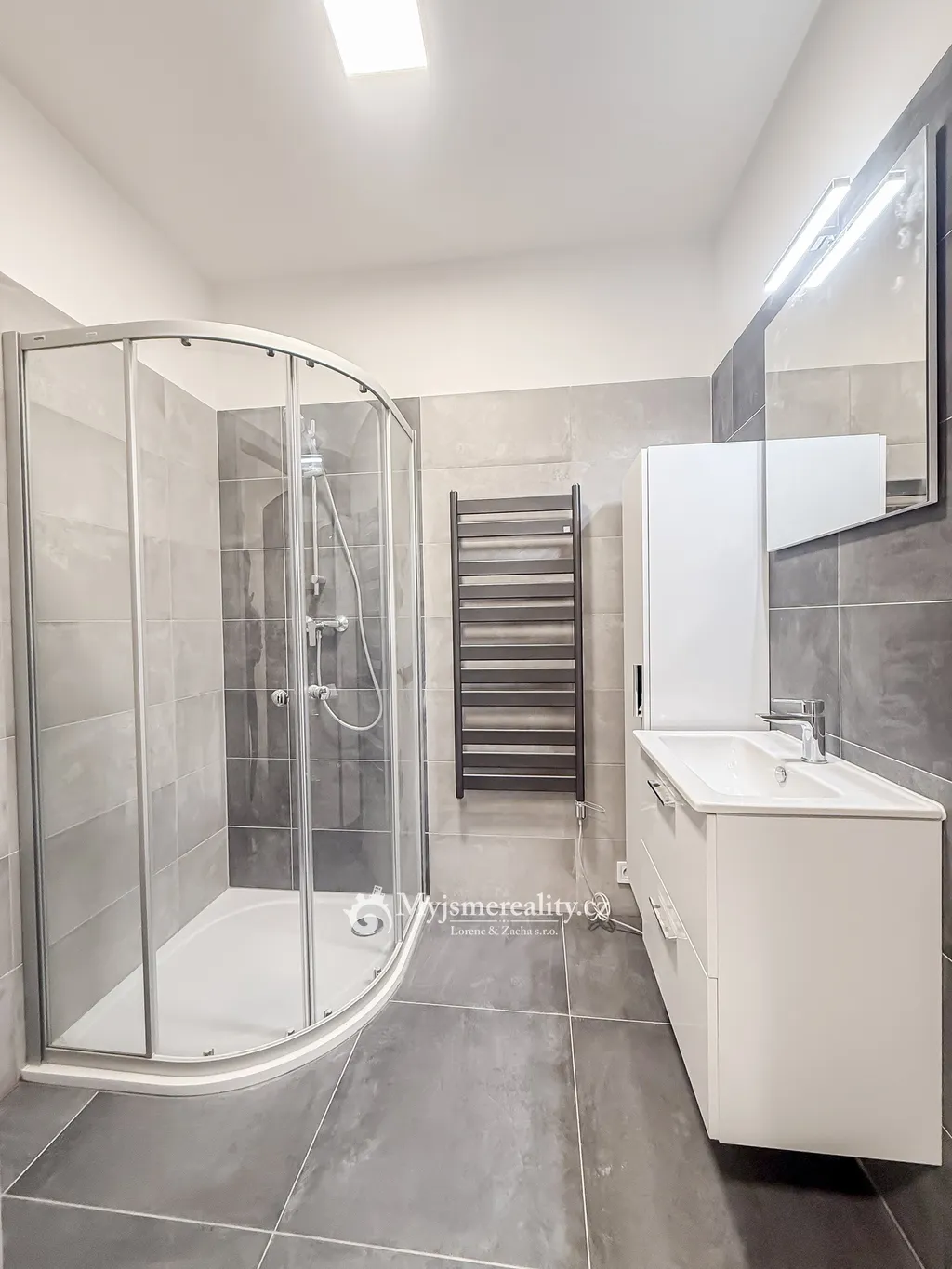 Dispozičně je byt velmi prostorný a kromě samostatné toalety s umyvadlem nabízí také technickou místnost s prostorem pro pračku a sušičku.