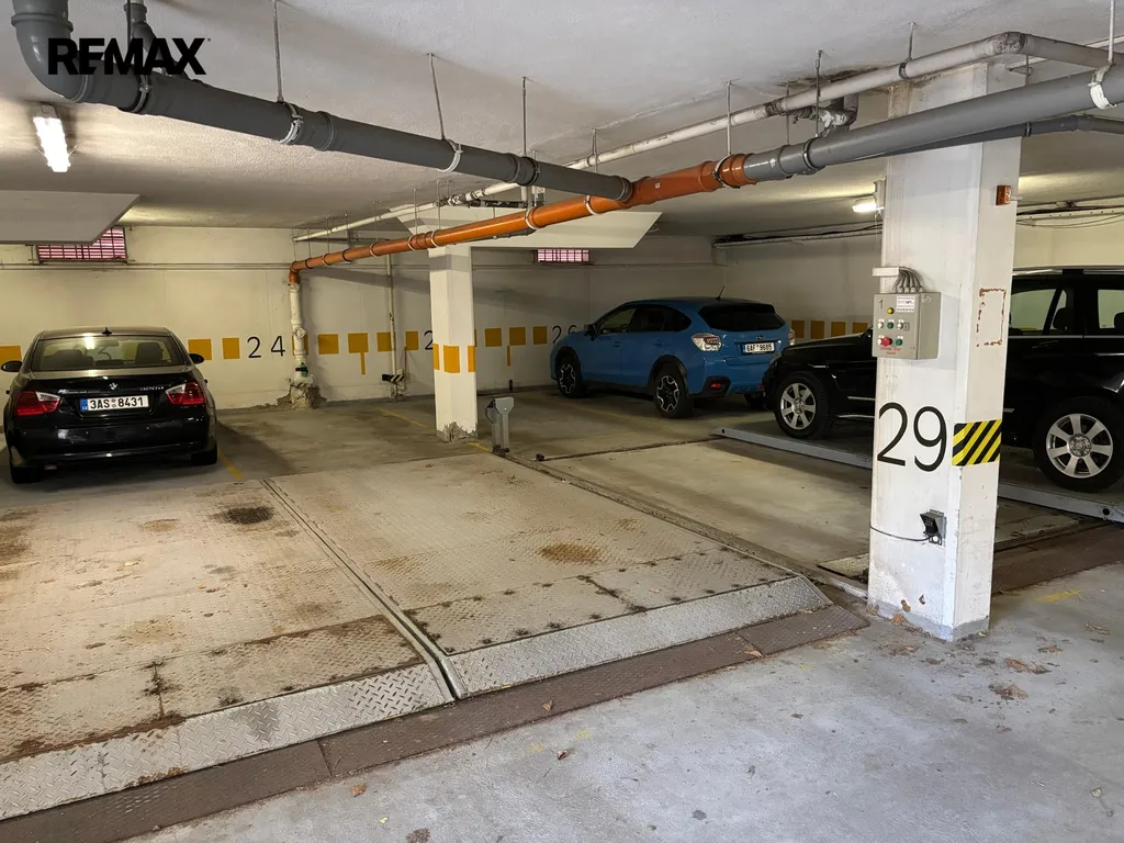 Vjezd do garáže je zajištěn přes automatická vrata na dálkové ovládání, přístup mají pouze vlastníci a nájemci domu.