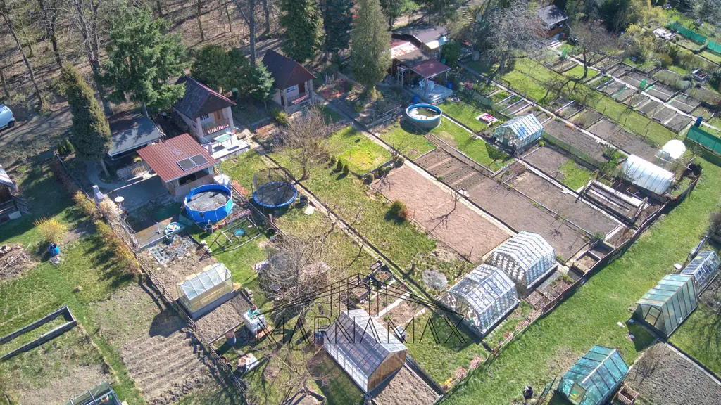 Zahrada o rozloze 367 m² je pečlivě udržovaná a připravená k okamžitému využití. Najdete zde upravené záhony pro pěstování vlastní zeleniny i dostatek prostoru pro květiny či relaxaci. Součástí zahrady je také prostorný skleník a trampolína.