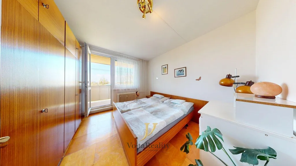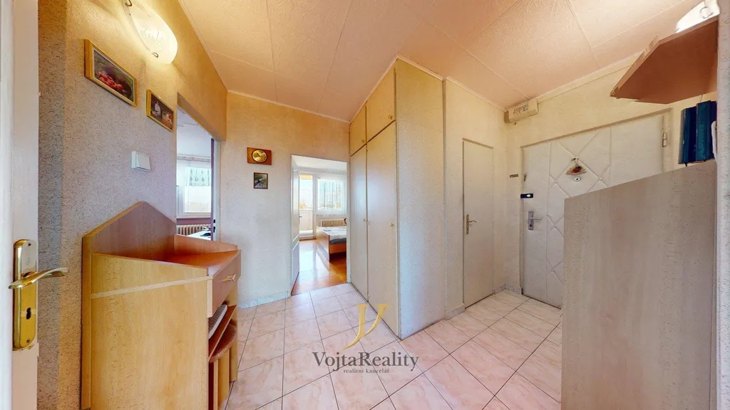 Byt sestává ze vstupní předsíně s vestavěnou šatnou, dvou neprůchozích pokojů, přičemž jeden disponuji rozšířenou lodžií o výměře 6m², obývacího pokoje, který je přístupný i z jídelní zóny kuchyně, samotné kuchyně a koupelny a WC. Součástí příslušenství bytu je skladovací kóje v mezipatře o výměře 2m² a standardní sklepní kóje o výměře 3m².