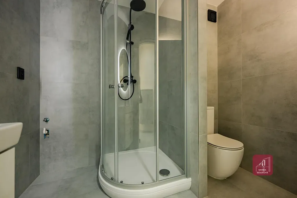 V koupelně sprchový kout, umyvadlo, toaleta, vývod na pračku.