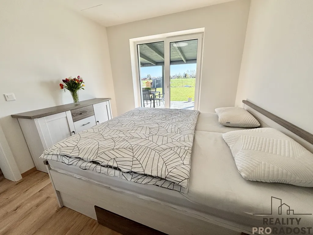 Dům je velmi hezky dispozičně řešený. V domě je vstupní chodba s vestavěnou skříní, velký prosluněný obývací pokoj s kuchyňským koutkem. Kuchyně je zhotovena na míru a je vybavena spotřebiči (indukční deska, trouba, mikrovlnka, digestoř a myčka). V obývacím pokoji je nainstalovaná klimatizace a krbová kamna. Z obývacího pokoje je vstup na velkou terasu, která je částečně zastřešená. Za obývacím pokojem je ložnice se vstupem přes balkónové dveře také na terasu. Dále jsou v domě 2 další neprůchozí pokoje, technická místnost, samostatné WC a velká koupelna s dvěma umyvadly, vanou, sprchovým koutem a WC. V domě jsou instalované venkovní žaluzie. Dům je napojen na elektřinu a obecní vodu, odpad je sveden do čističky. Vytápění a ohřev vody zajišťuje tepelné čerpadlo.
