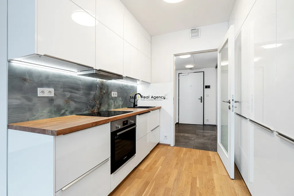 Byt byl navržen s důrazem na maximální funkčnost, světlo a nadčasovost. Dominantou je otevřený obytný prostor s moderní, plně vybavenou kuchyňskou linkou se spotřebiči Bosch, který plynule navazuje na klidnou lodžii orientovanou do zeleně. Ta nabízí dostatek prostoru pro pohodlné posezení – ideální místo pro ranní kávu i večerní relax.