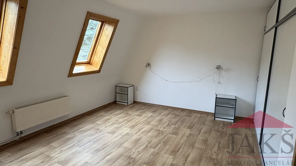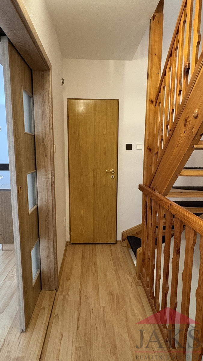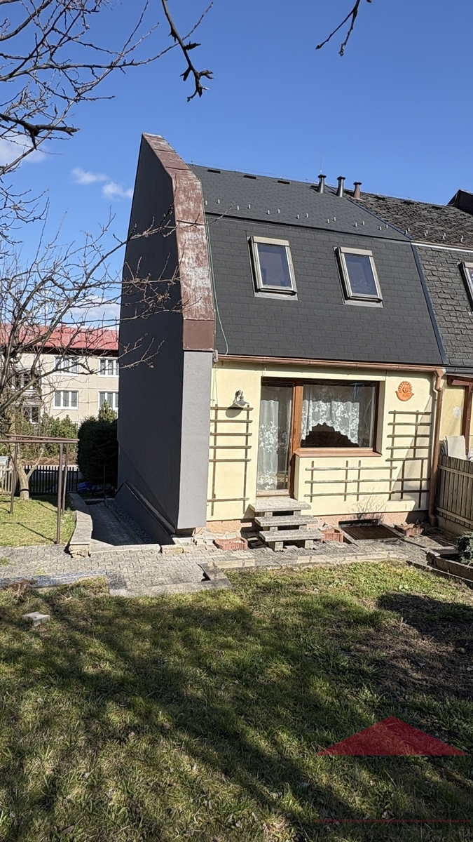 Popis: vydlážděné parkovací místo před domem; suterén 42,33 m2; garáž, technická místnost (el. boiler, umyv., vývod na pračku, rozvod dálkového topení pro sousední řadovky), chodba s dřevěným schodištěm do 1.NP 43,52 m2: podesta (kazetové dveře), sam. WC s umyv., prostorný obývací pokoj 36 m2 s kuch. koutem (kuch. linka s vestavěnou lednicí s mrazákem) a franc. dveřmi na terasu se zahradou; 2.NP 36,05 m2: podesta, koupelna (umyv. se zrcadlem, velká rohová vana, WC, topný žebřík) s oknem, 2x ložnice (vestavěné šatní skříně) a nízká půda.