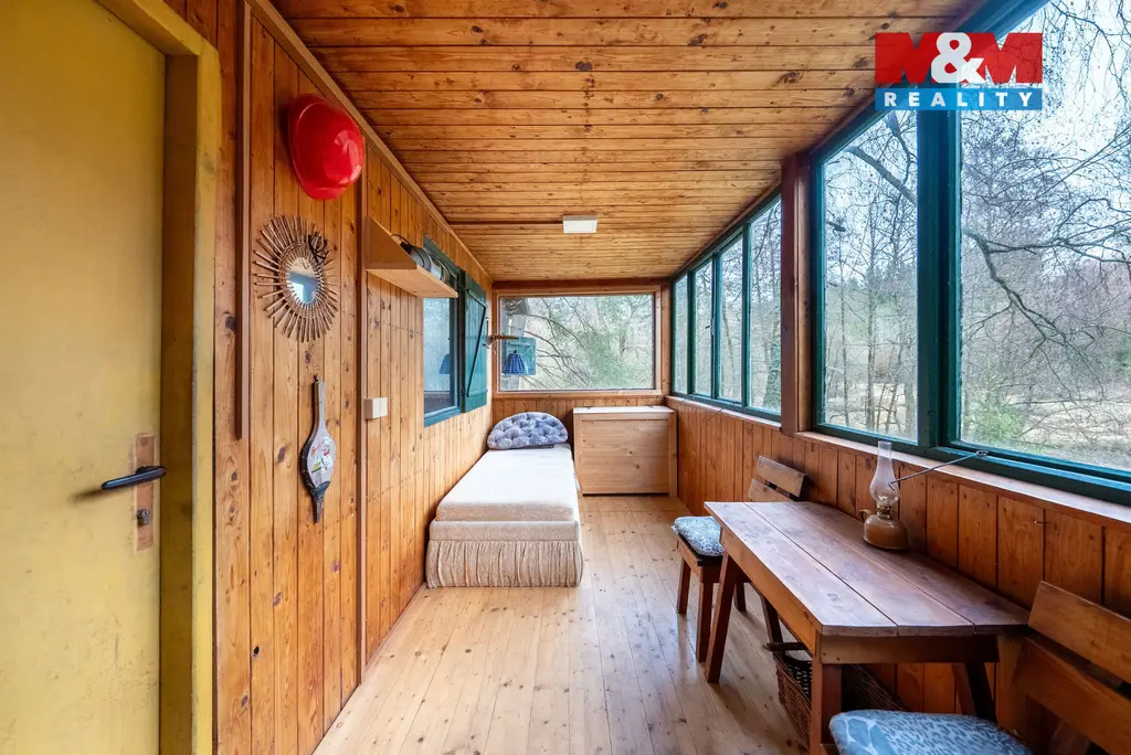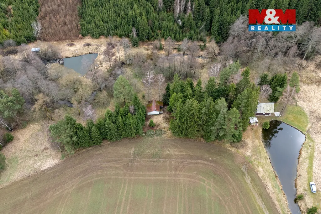 Okolí tvoří les a pouze jedna další chata s rybníčkem, což podtrhuje klid a soukromí tohoto místa. Pozemek nabízí dostatek prostoru pro odpočinek, zahradu nebo posezení.