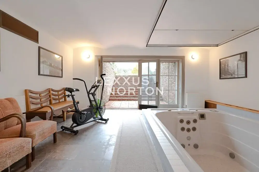 Hlavní vila je orientována do rozlehlé parkové zahrady, která tvoří přirozenou vizuální i kompoziční osu celé nemovitosti. Promyšlená parková úprava zahrnuje jezírka, kašnu, vzrostlé stromy, okrasné keře i historické anglické růže a vytváří harmonické prostředí s charakterem soukromého parku. Zahrada funguje jako samostatný ekosystém s výjimečným klidem a vysokou mírou soukromí. Zároveň je přirozeným prodloužením obytných prostor domu a nabízí velkorysý pocit prostoru.