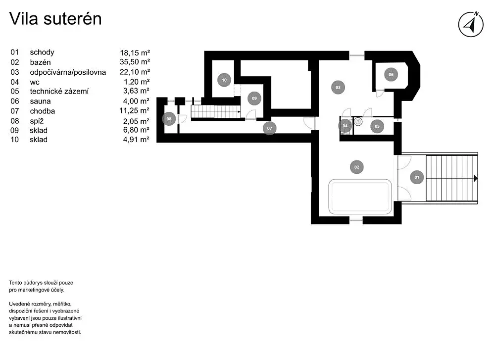 Suterén je věnován relaxaci a technickému provozu domu s wellness zónou, skladovacími prostory a přímým výstupem do zahrady.