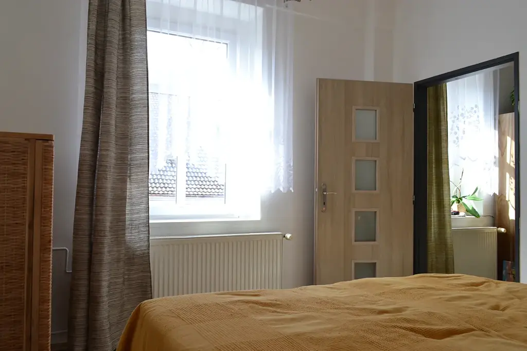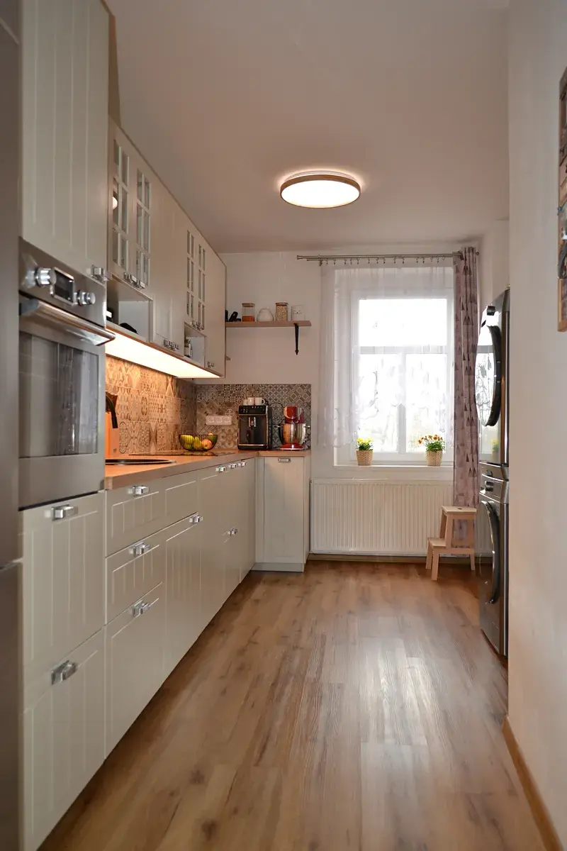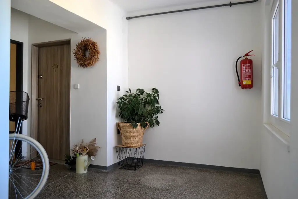 Je situován ve 2. patře historického domu s orientací oken do tří světových stran – jihozápad (ložnice a obývací pokoj), jihovýchod (pokoj) a sever (vstupní chodba a kuchyně). Nemovitost prošla postupnou citlivou renovací od podlahových krytin, štuků stěn, elektroinstalace, topného systému až po nově instalovanou kuchyňskou linku s kvalitními spotřebiči, vyrobenou na míru. Koupelna vybavena vanou, toaleta je samostatně. Podlahy kvalitní vinylové, instalace v r. 2023.
