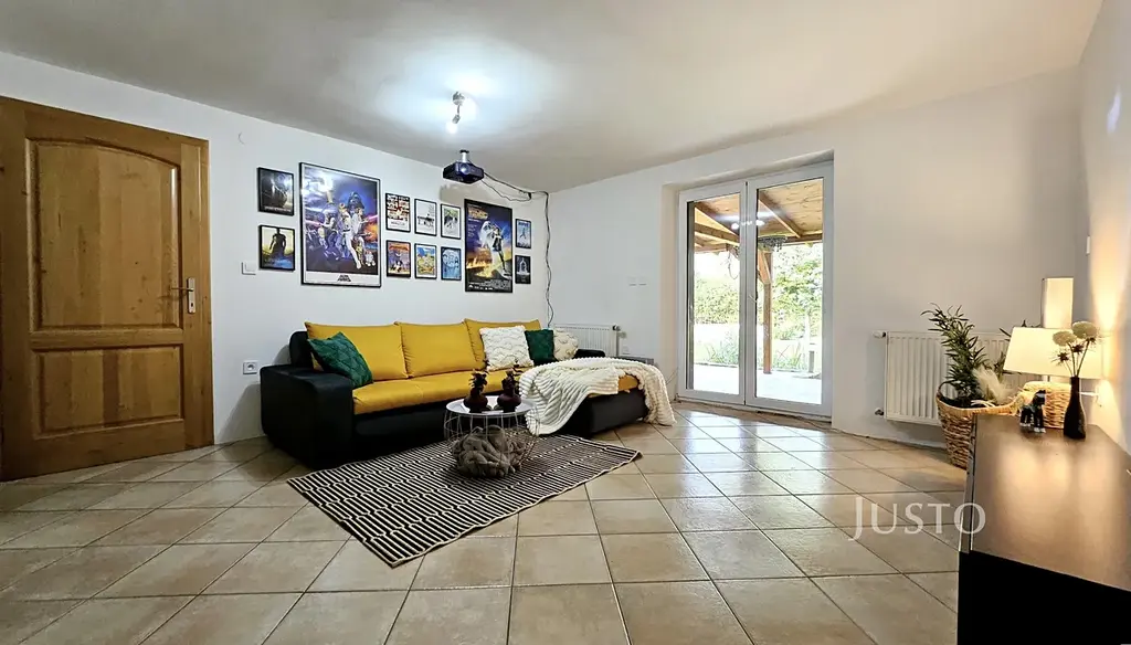 Hned po vstupu do domu vás okouzlí vzdušnost a kreativita interiéru. V přízemí na vás čeká relaxační hala (současní majitelé z ní udělali knihovnu s krbovými kamny –- ideální místo pro útěk před každodenními starostmi). Je tu také místnost se šatnou, která momentálně slouží jako domácí kino – ano, vlastní kino! A technika v domě zůstane, takže si můžete pustit film i bez vybalování krabic. Z místnosti je přímý vstup na terasu a zahradu s bazénem, který už sice nějakou dobu neviděl plavky, ale i tak je to luxusní prvek na zahradní párty.