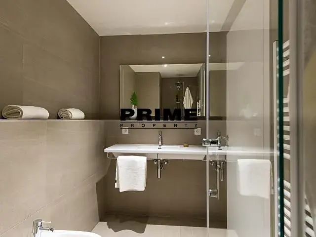 Fotografie bytu jsou ilustrativní z podobného bytu v budově. Dispozice bytu: vstupní předsíň, obývací pokoj (29m2) s jídelní částí a s otevřenou, plně vybavenou italskou kuchyní se spotřebiči (indukční varná deska, elektrická trouba, lednice s mrazákem, myčka a mikrovlnná trouba), nádobím a kuchyňským náčiním a vstupem na terasu (19m2), ložnice (16m2) se vstupem na terasu, koupelna (vana, sprchový kout, umyvadlo, toaleta, bidet) a samostatné WC. Dřevěné podlahy a velkoformátová dlažba. Rekuperace vzduchu, podlahové topení, internet, videotelefon, alarm.