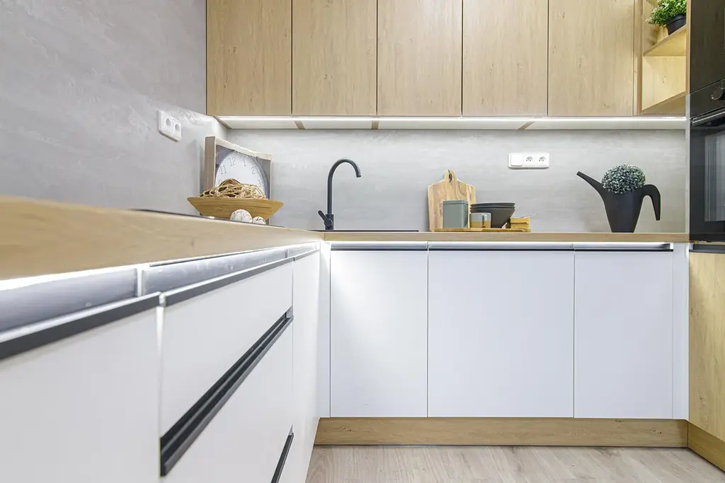 Byt disponuje obytnou kuchyní o vel. 14 m2 s novou kuchyňskou linkou do tvaru U v kombinaci bílé barvy a dekoru dřeva s vestavěnými spotřebiči lednice s mrazákem, myčka, varná deska, elektrická a mikrovlnná trouba. Kuchyňskou linku ocení zejména hospodyňky díky velké pracovní ploše a úložnému prostoru.