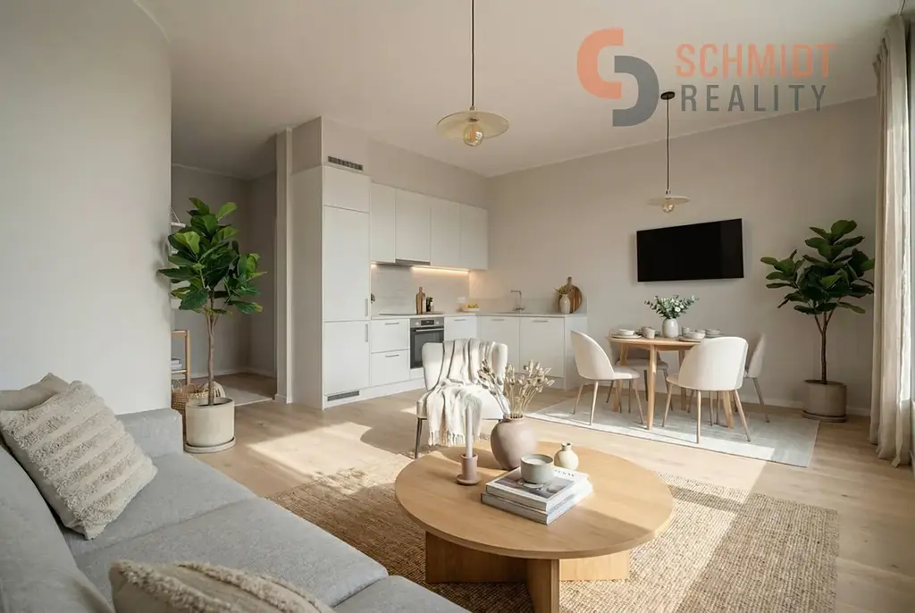 Předmětem prodeje je byt bez vyobrazeného nábytku; vizualizace znázorňují možné budoucí uspořádání interiéru.