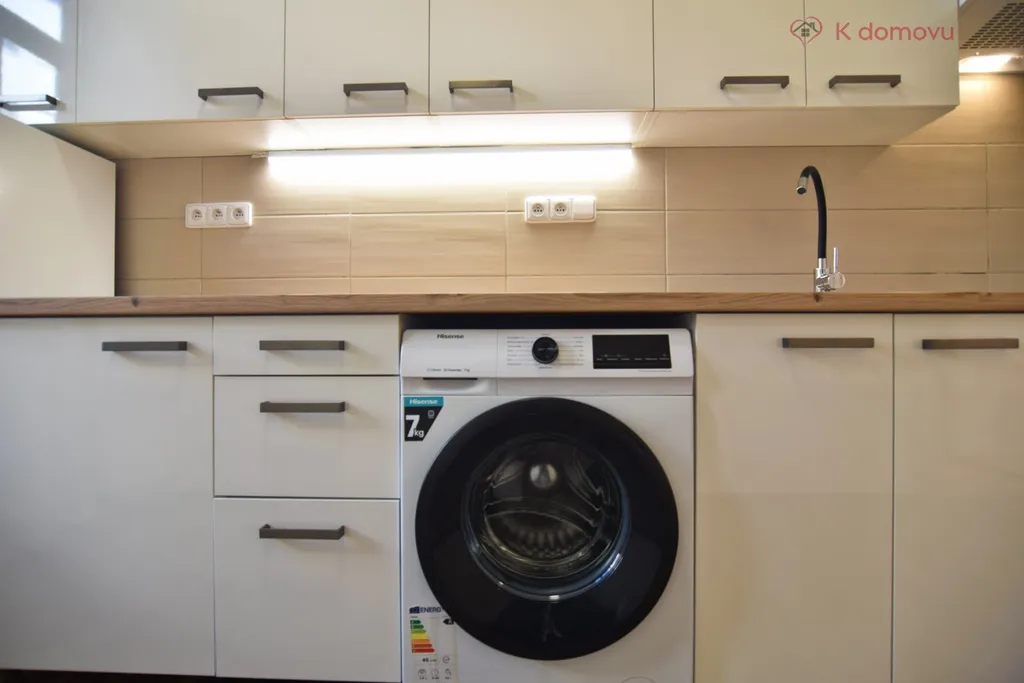 • Kuchyně vybavena kuchyňskou linkou, plynovou varnou deskou s digestoří, troubou, pračkou a lednicí s mrazákem