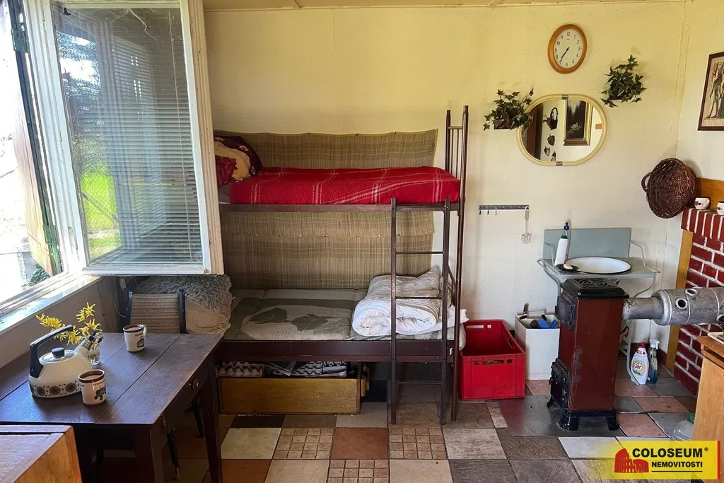 Chata disponuje hlavní obytnou místností s možností vytápění menšími kamny, která poskytuje příjemné zázemí pro odpočinek i pobyt během chladnějších dnů. Dále je k dispozici menší vedlejší místnost vhodná jako úložný prostor a zadní část chaty, kde se nachází suché WC. Pozemek se nachází na okraji zahrádkářské kolonie, což zajišťuje klid a soukromí. Z jedné strany jej lemuje pouze pole, které nabízí nerušený výhled do okolní krajiny a na lesy.