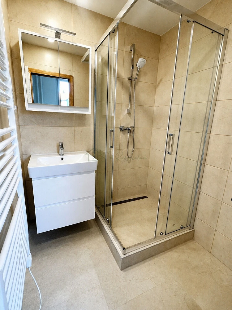 Byt prošel kompletní rekonstrukcí a čeká na své první nájemníky – od renovace zde dosud nikdo nebydlel. Vše je nové, čisté a připravené k okamžitému nastěhování. Součástí modernizace jsou také elegantní obložkové dveře, které podtrhují celkový dojem z interiéru. Nová kuchyňská linka, vestavná myčka, elektrická trouba, varná deska, digestoř vedená do komínu.