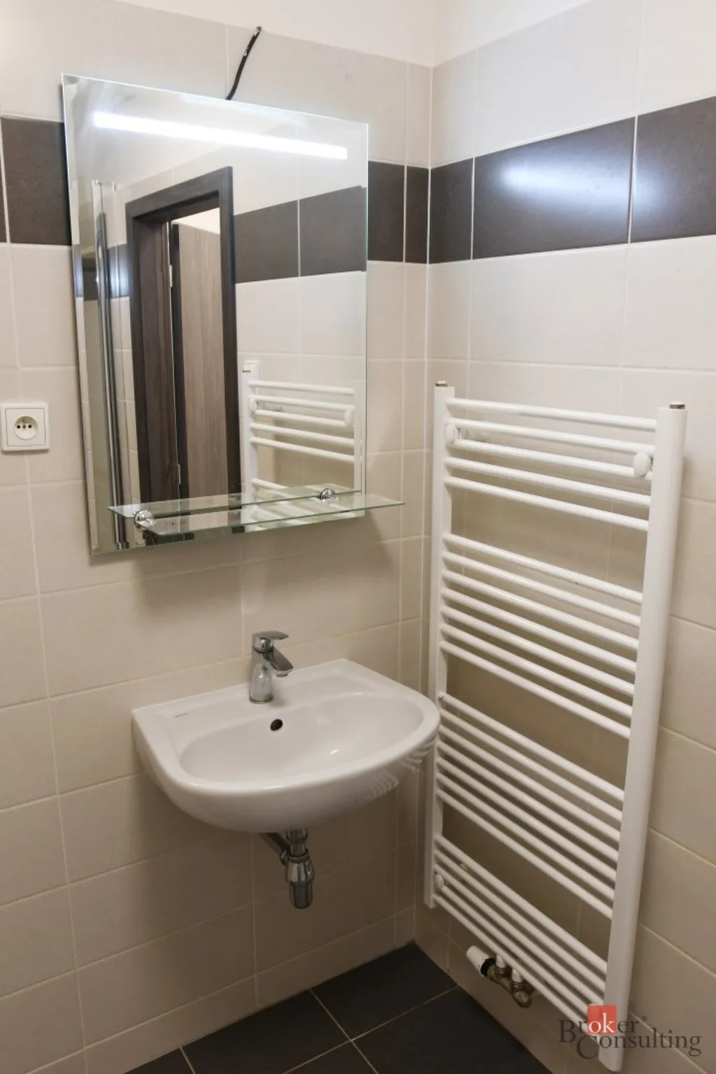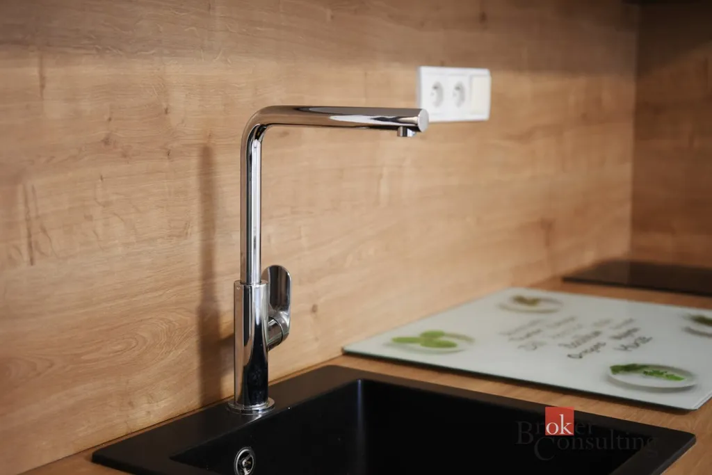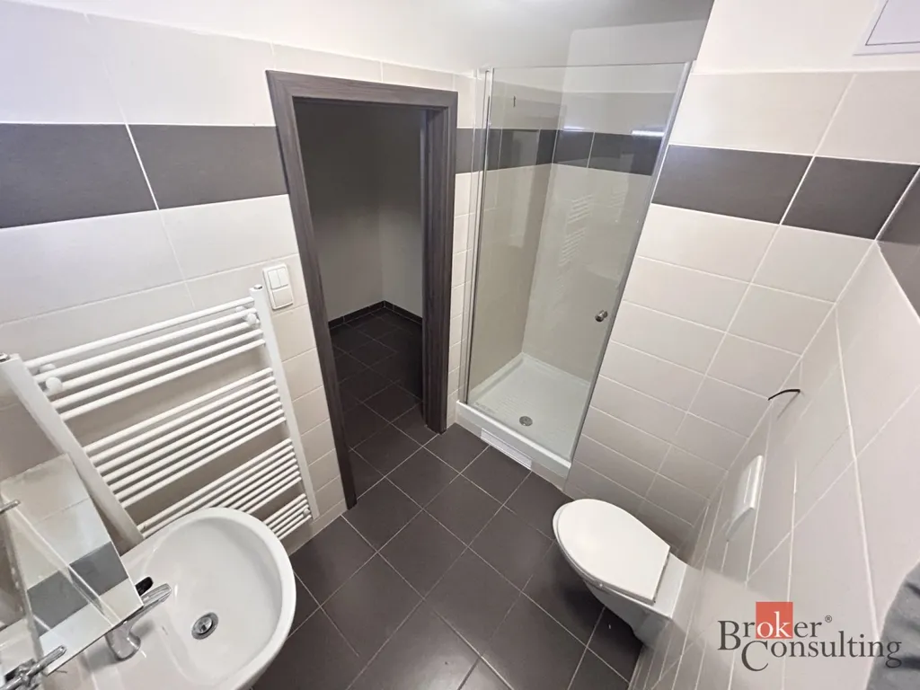 Byt disponuje moderní kuchyňskou linkou vybavenou veškerými spotřebiči. Koupelna je vybavena sprchovým koutem, toaletou a umyvadlem.