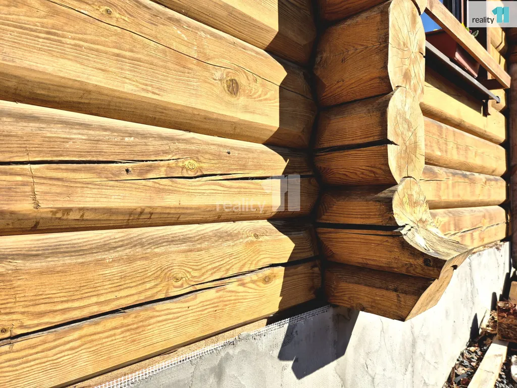 Součástí nemovitosti je také garáž v dekoru dřeva výměře cca 26 m², která přirozeně ladí se srubem.