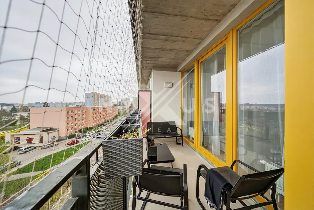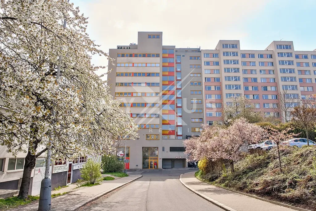 Velkým benefitem je také samostatná šatna a komora v bytě, díky nimž interiér nepůsobí zahlceně a nabízí praktické úložné zázemí. Byt se nachází v 6. nadzemním podlaží cihlového domu z roku 2011. Jižní orientace a francouzská okna přinášejí do interiéru velmi dobré světelné podmínky, zatímco vyšší podlaží nabízí příjemný odstup od okolního ruchu i otevřenější výhled směrem k Milíčovskému lesu. Komfort každodenního fungování podporuje garážové stání, sklep, kolárna v domě, centrální vytápění i samostatné WC. K dispozici jsou navíc dva osobní výtahy a dva auto výtahy.