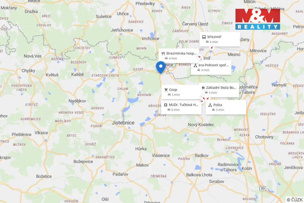 Velkou výhodou je dobrá dostupnost do města Tábor, cca 20 minut, kde se nachází kompletní občanská vybavenost.