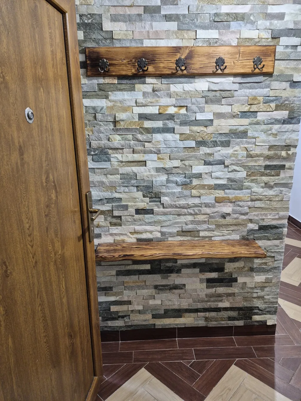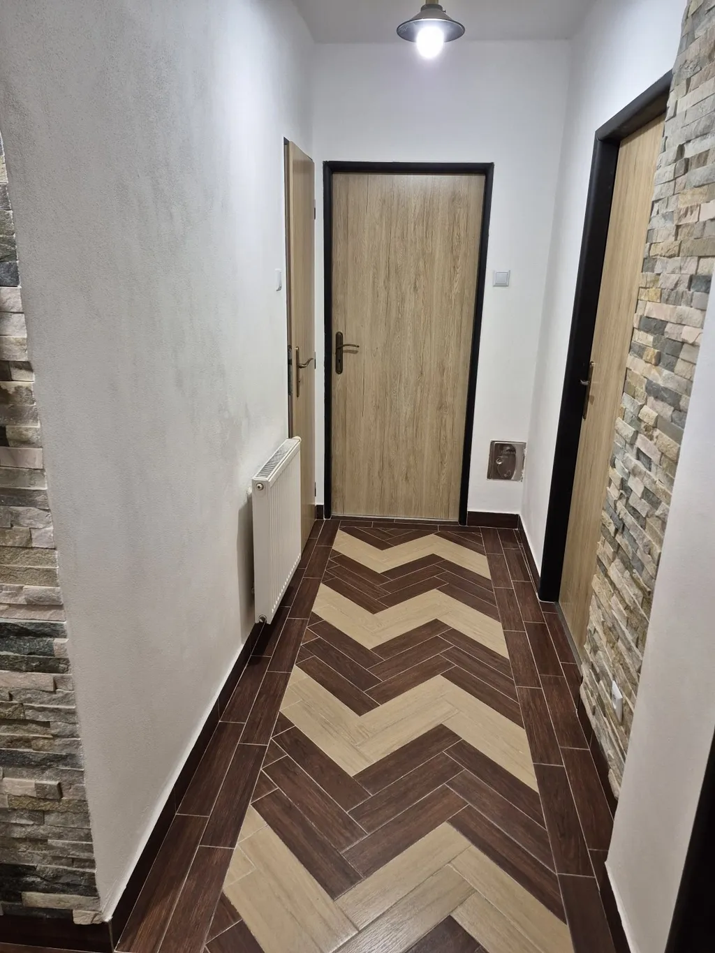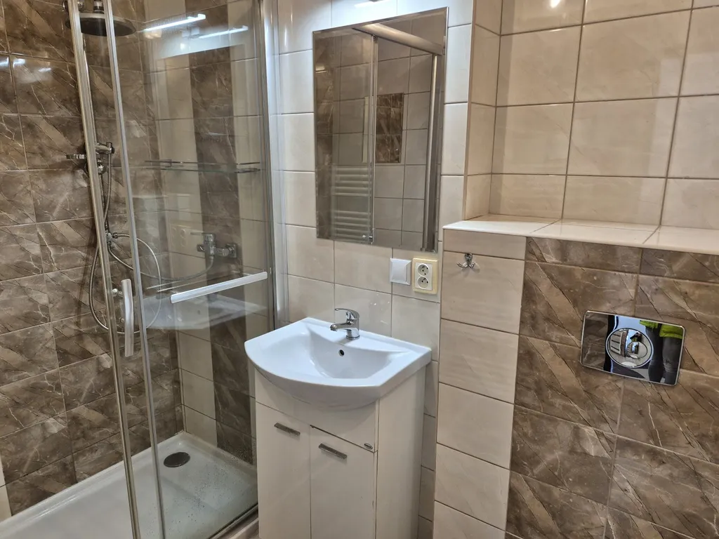 Po vstupu do bytu se nacházíme v chodbě, kde na levé straně je kuchyň se špajzem. V kuchyni je k dispozici myčka na nádobí, plynový sporák a lednice. Zároveň je zde příprava na pračku. Při vstupu do bytu po pravé straně jsou k dispozici dvě ložnice, obývací pokoj s krbovými kamny a balkónkem, který poskytuje krásný výhled do krajiny a na dětské hřiště. Dále je zde koupelna s toaletou. V koupelně je zděný sprchový kout.