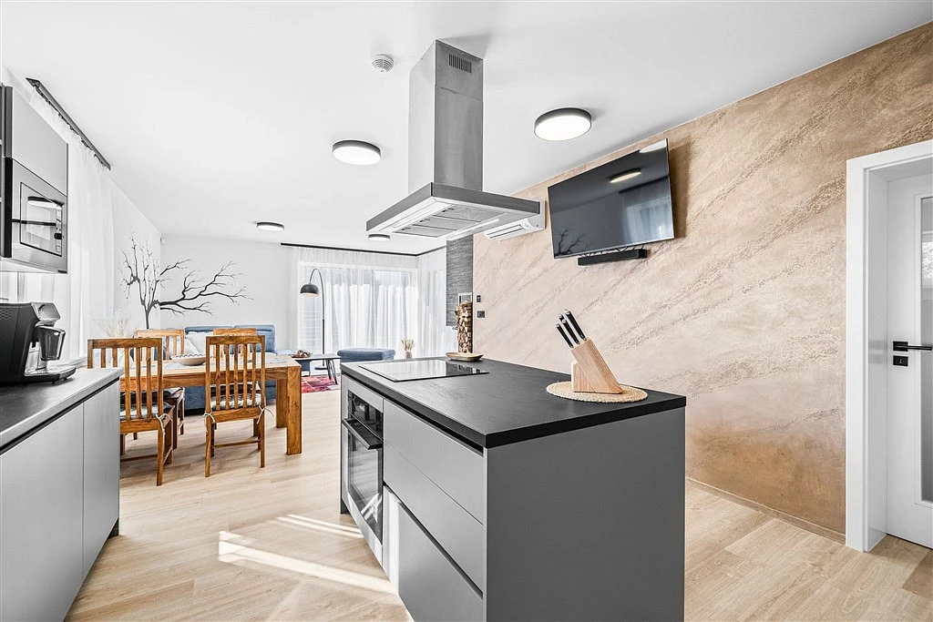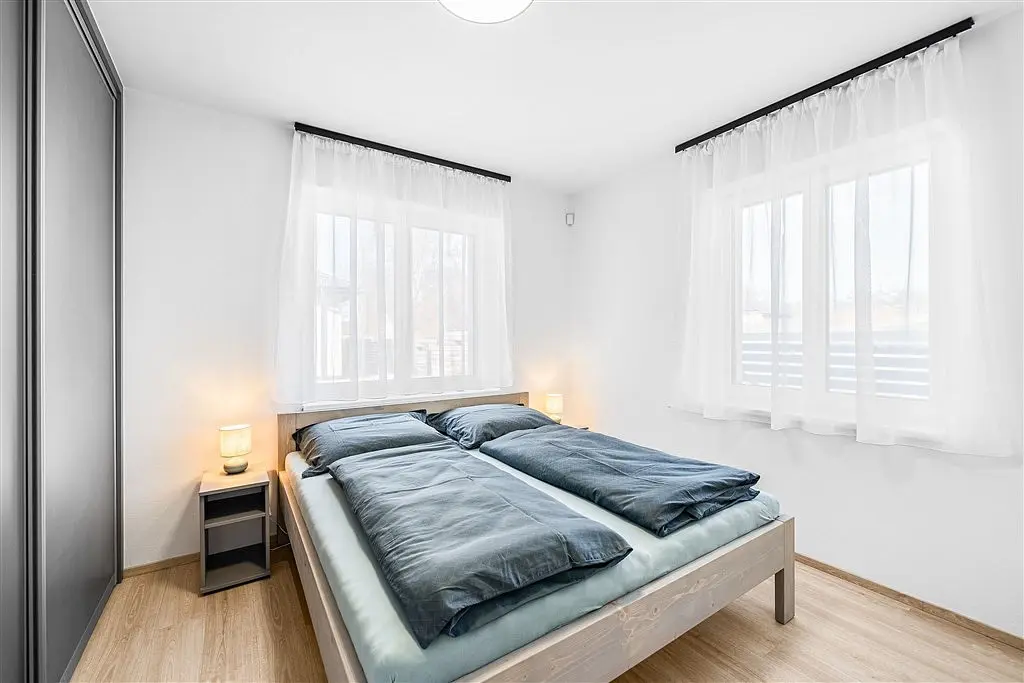 Samozřejmostí jsou vestavěné skříně v každém pokoji a kompletní vybavení, které je již zahrnuto v ceně – stačí se jen nastěhovat.