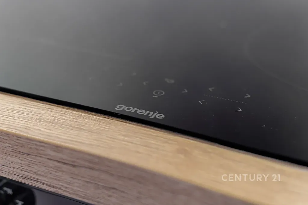 Dominantou bytu je kuchyňská linka na míru s moderními prvky, LED podsvícením a nočním osvětlením na čidlo, doplněná o kvalitní spotřebiče značky Gorenje.