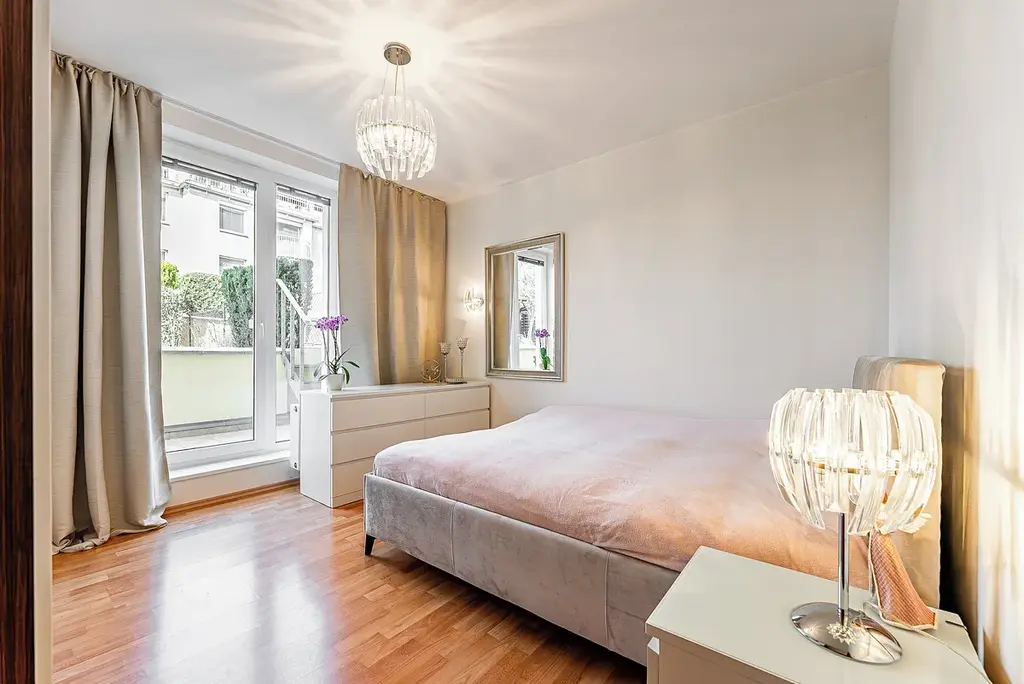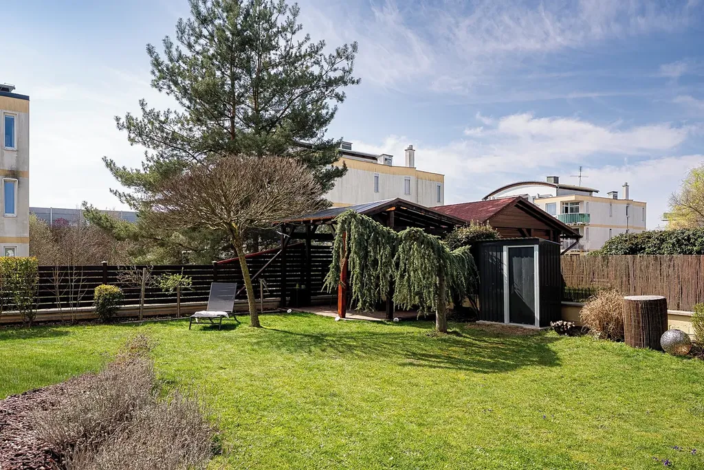 Skutečným unikátem je přímý vstup z obou pokojů na zahradu (179 m²), která nabízí dvě terasy. Tento venkovní prostor poskytuje ideální zázemí pro relaxaci i aktivní trávení času – najdete zde pergolu, zahradní domek i dostatek prostoru pro grilování či hraní dětí. Udržovaná zeleň a vzrostlé stromy zajišťují příjemné soukromí.