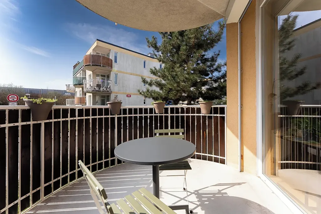 Dominantou bytu je obývací pokoj (22 m²) plynule propojený s moderním kuchyňským koutem (12 m²). Díky velkoformátovým oknům a jihovýchodní orientaci je prostor po celý den příjemně prosvětlený. Kuchyně je plně vybavena a nabízí dostatek pracovní plochy. Z obývací části je přímý vstup na balkon (7,54 m²) s předokenní roletou – ideální místo pro ranní kávu.