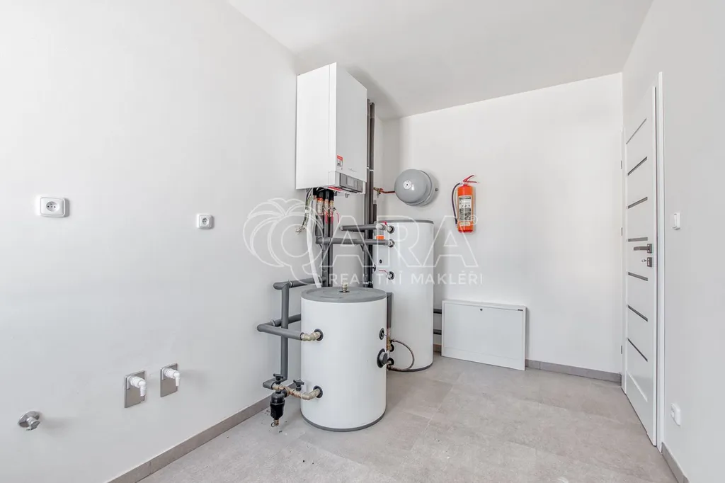 Moderní kuchyňská linka zahrnuje nové spotřebiče, včetně elektrické trouby, indukční desky, myčky, mikrovlnky a lednice. Obývací pokoj je navíc připraven na instalaci krbu nebo krbových kamen.