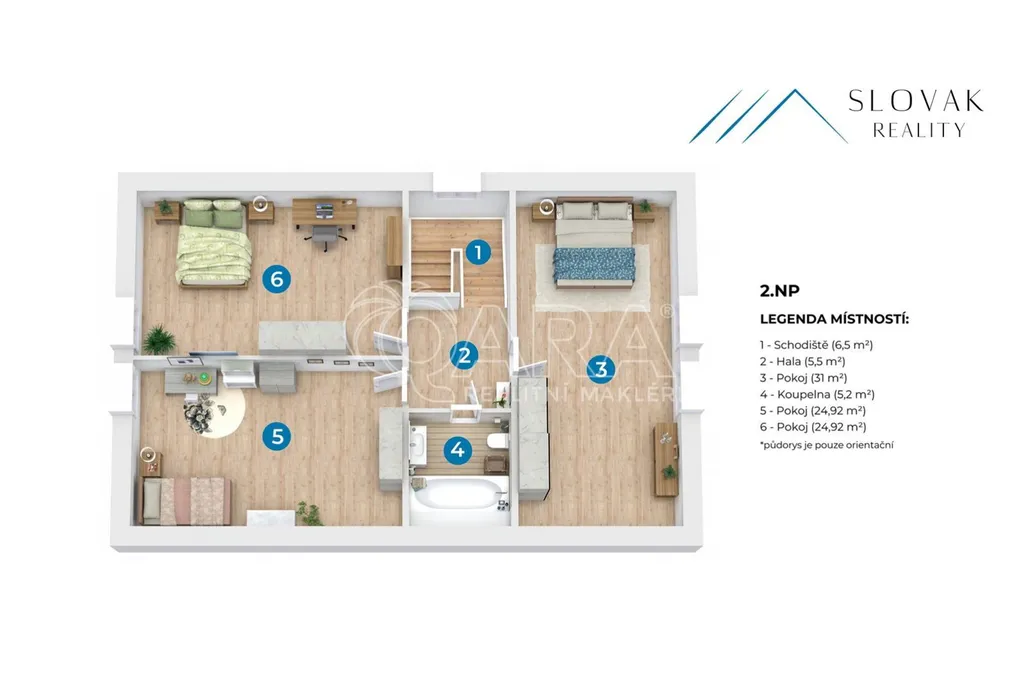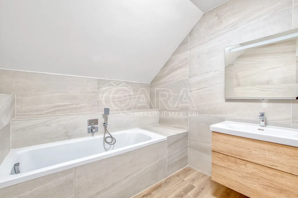 Druhé patro nabízí tři velké, světlé pokoje každý z nich s dostatkem prostoru pro dětský pokoj, pracovnu nebo další ložnici. Součástí patra je rovněž koupelna s vanou a nikami.