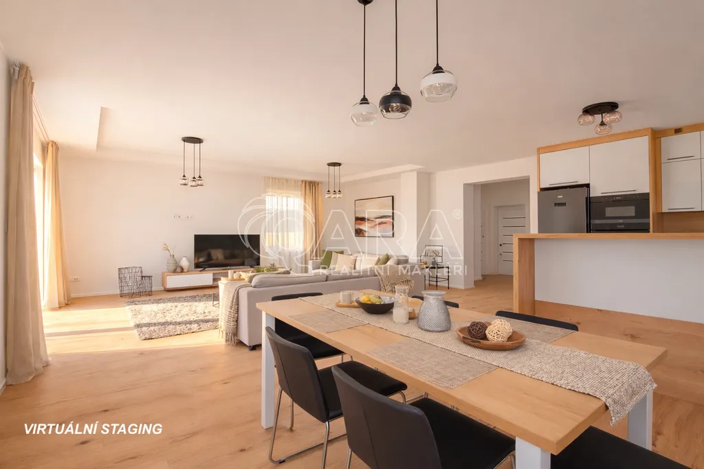 Dům byl dokončen v roce 2024 a je navržen tak, aby splňoval nároky na moderní a úsporné bydlení. Na první pohled vás zaujme velký obývací pokoj propojený s kuchyní o rozloze 50 m, který disponuje přímým vstupem na terasu.